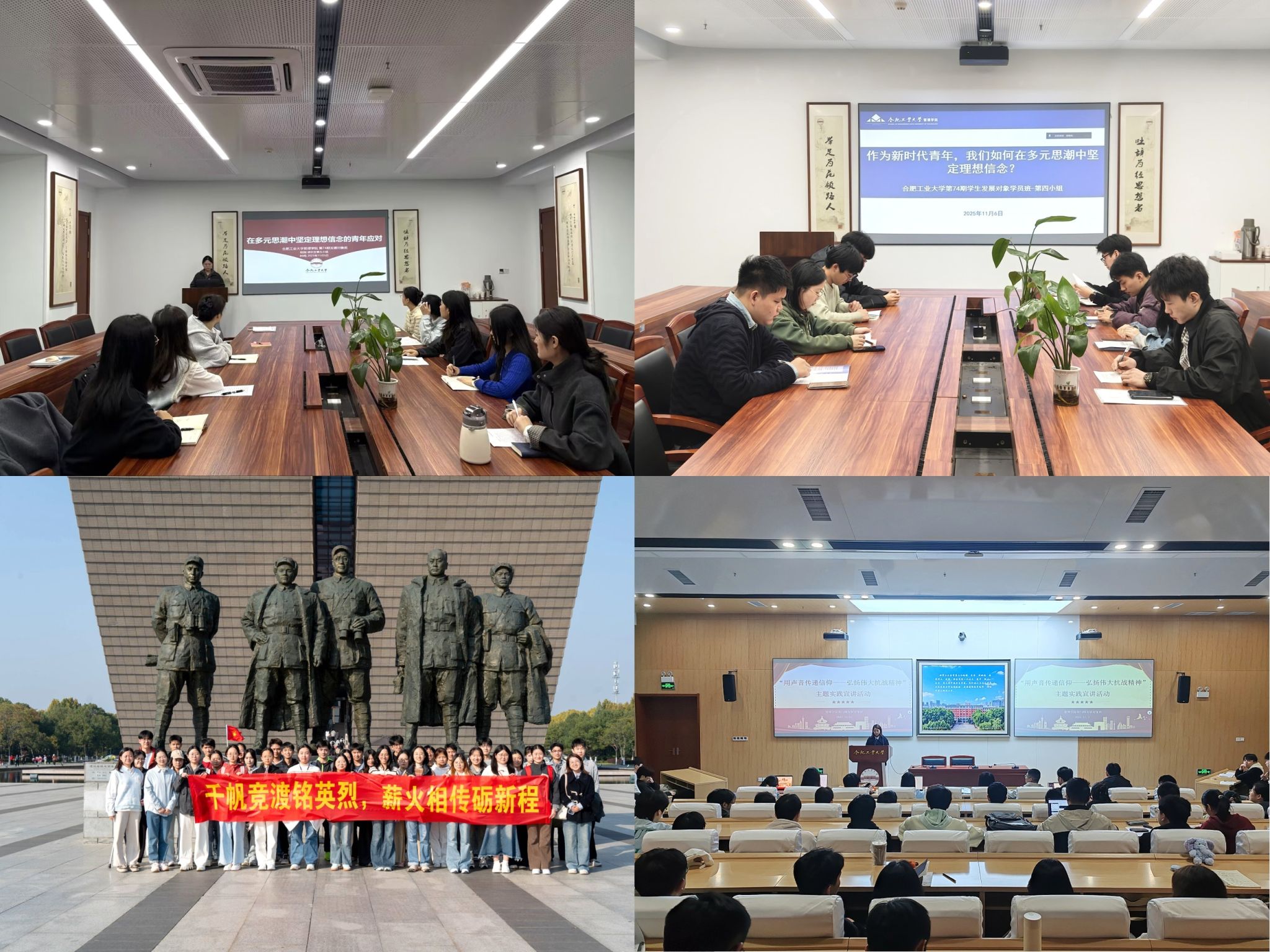 11月3日至8日,班级组建了5个研讨小组围绕“在多元思潮中坚定理想信念的青年应对”核心主题开展专题研讨,全体学员表示新时代青年身处多元思潮交织碰撞的复杂环境,更需保持清醒的政治头脑和坚定的理想信念,应该从思想层面以及行动层面真正做到发挥先锋模范作用;11月5日,全体学员赴渡江战役纪念馆开展红色研学,通过系列历史照片、革命文物和场景复原,深切感悟渡江战役的壮阔历程与革命先辈的献身精神,坚定“听党话、跟党走”的信念;11月11日,班级在管理学院第二报告厅举办“抗战精神宣讲会”,本次宣讲会由班内5位学员担任宣讲人,面向全体发展对象及全体入党积极分子开展宣讲,5位学员宣讲人结合详实史料和英雄事迹解读抗战精神,引发全体发展对象及入党积极分子的强烈共鸣。