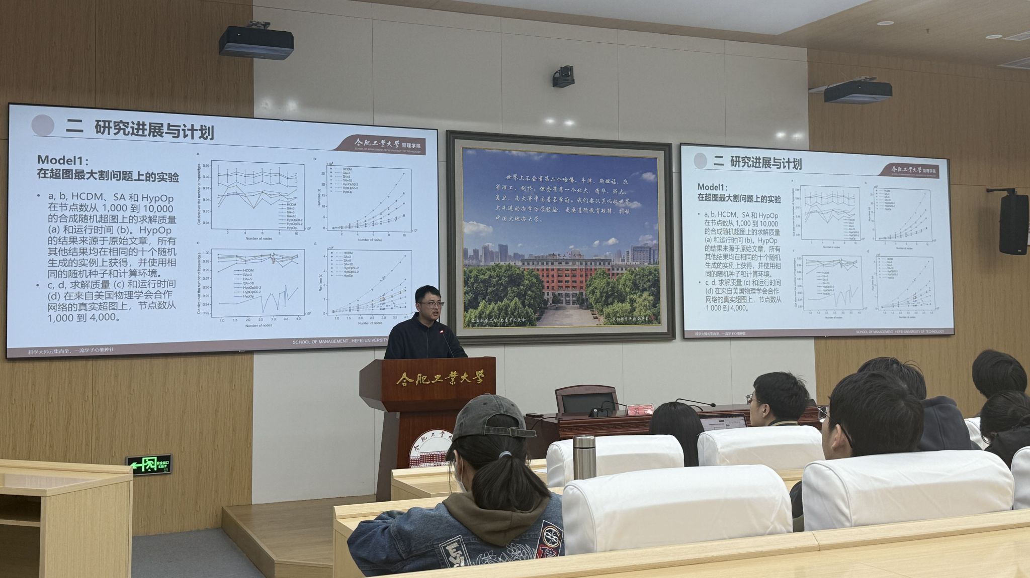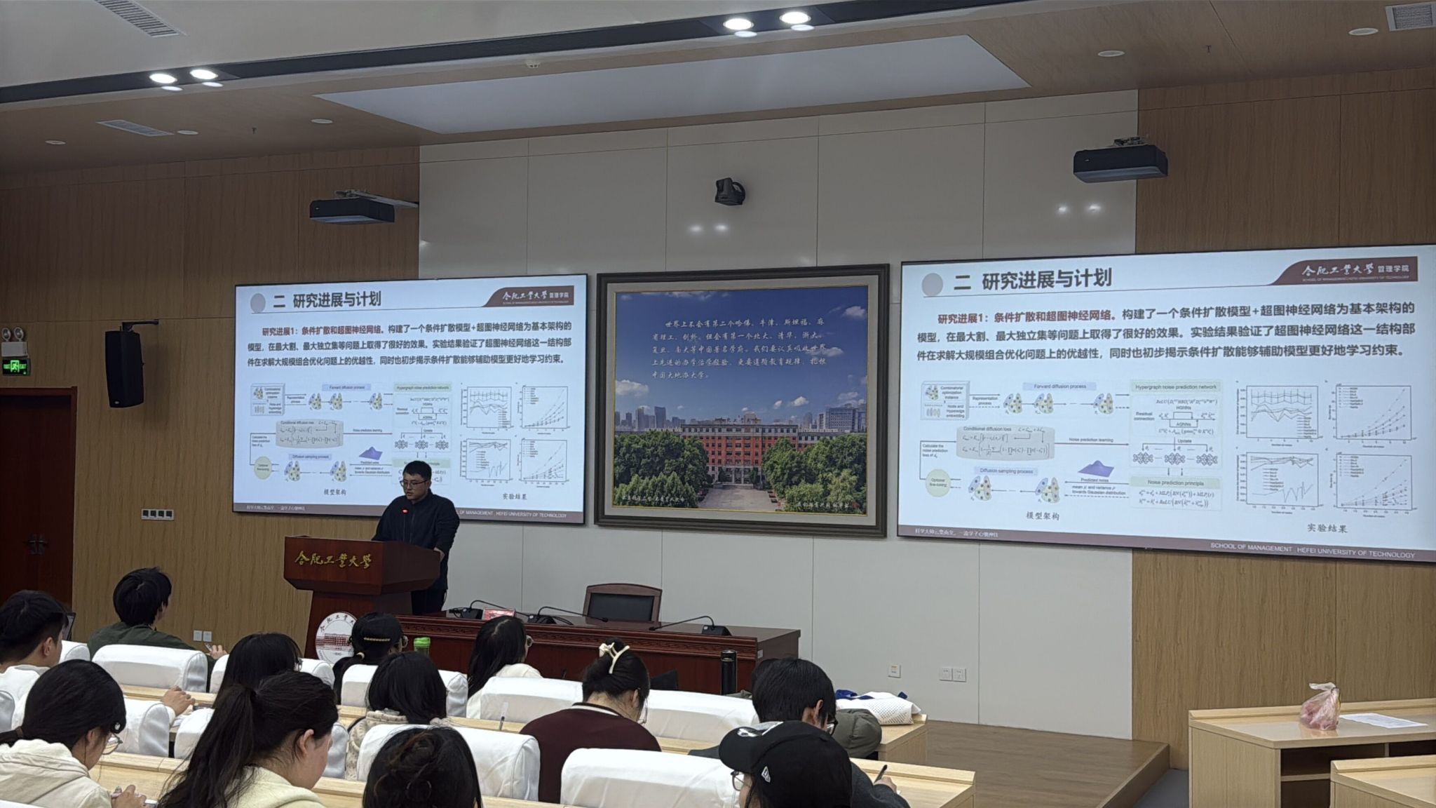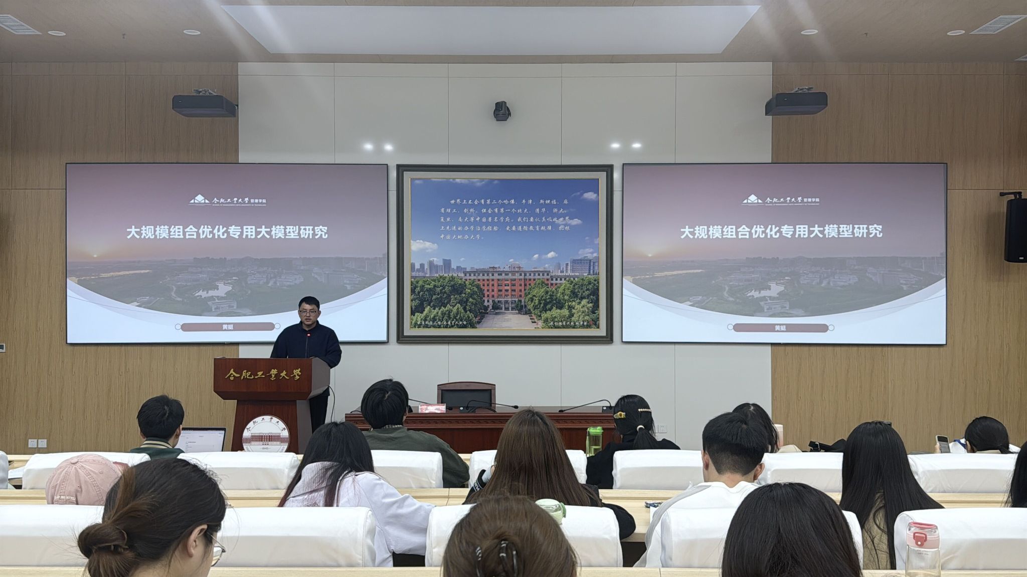 2026年4月3日晚上19点,管理学院在屯溪路校区管理学院第二报告厅举办合肥工业大学第326期博睿沙龙活动。活动邀请合肥工业大学管理学院讲师黄挺为主讲嘉宾,分享主题为:大规模组合优化专用大模型研究。管理学院团委书记、研究生辅导员王宏蕾老师与30余名研究生参与本次活动。