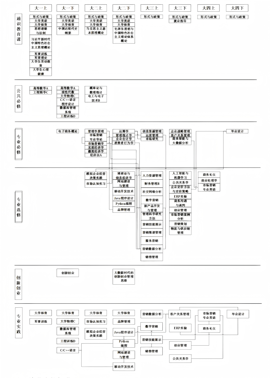 创业管理(32学时/2学分)、营销策划(32学时/2学分)、Java程序设计(32学时/2学分)、网站建设与管理(32学时/2学分)、移动开发技术(32学时/2学分)、Python编程(32学时/2学分)、社交网络分析(32学时/2学分)、人工智能与机器学习(32学时/2学分)、营销技能展示(36学时/1.5学分)、销售管理(32学时/2学分)、ERP实验(48学时/2学分)、市场营销案例分析(32学时/2学分)、商务礼仪(32学时/2学分)、商业伦理学(32学时/2学分)、公共关系学(32学时/2学分)、模拟企业经营决策实践(48学时/2学分)、财务管理B(40学时/2.5学分)、人力资源管理(32学时/2学分)、博弈论与信息经济学(32学时/2学分)、管理研究方法(32学时/2学分)、物流与供应链管理(32学时/2学分)、市场认识实习(48学时/2学分)、品牌管理(32学时/2学分)、新产品开发与管理(32学时/2学分)、营销渠道管理(32学时/2学分)、数字营销(32学时/2学分)、企业定价方法与定价策略(32学时/2学分)、商务沟通与谈判(32学时/2学分)、服务营销(32学时/2学分)、市场营销专业英语(16学时/1学分)、营销数据分析(32学时/2学分)