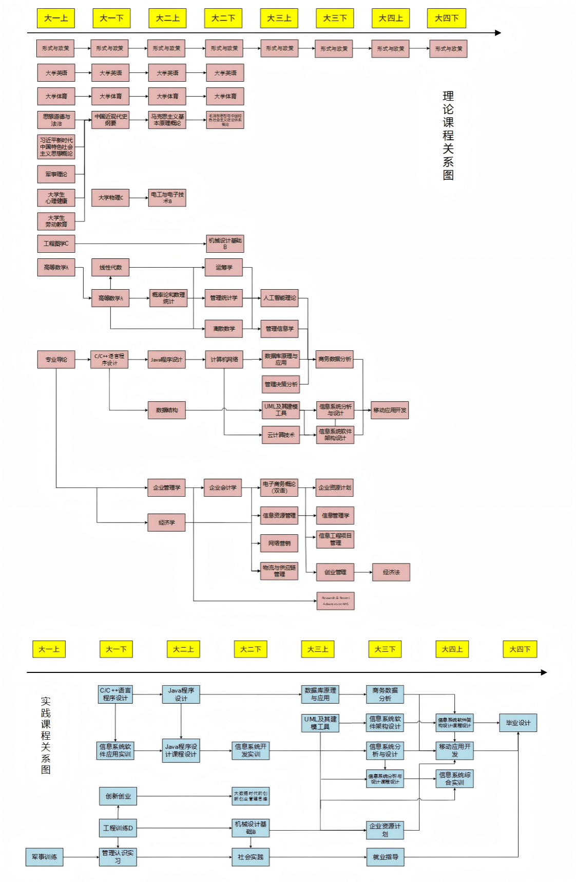 核心课程:管理信息学、信息管理学、信息系统分析与设计、商务数据分析、信息系统软件架构设计、企业资源计划、信息工程项目管理、企业管理学、运筹学、管理统计学、企业会计学、经济学、数据库原理与应用、计算机网络、离散数学、数据结构、Java 程序设计、信息资源管理、UML及其建模工具。
