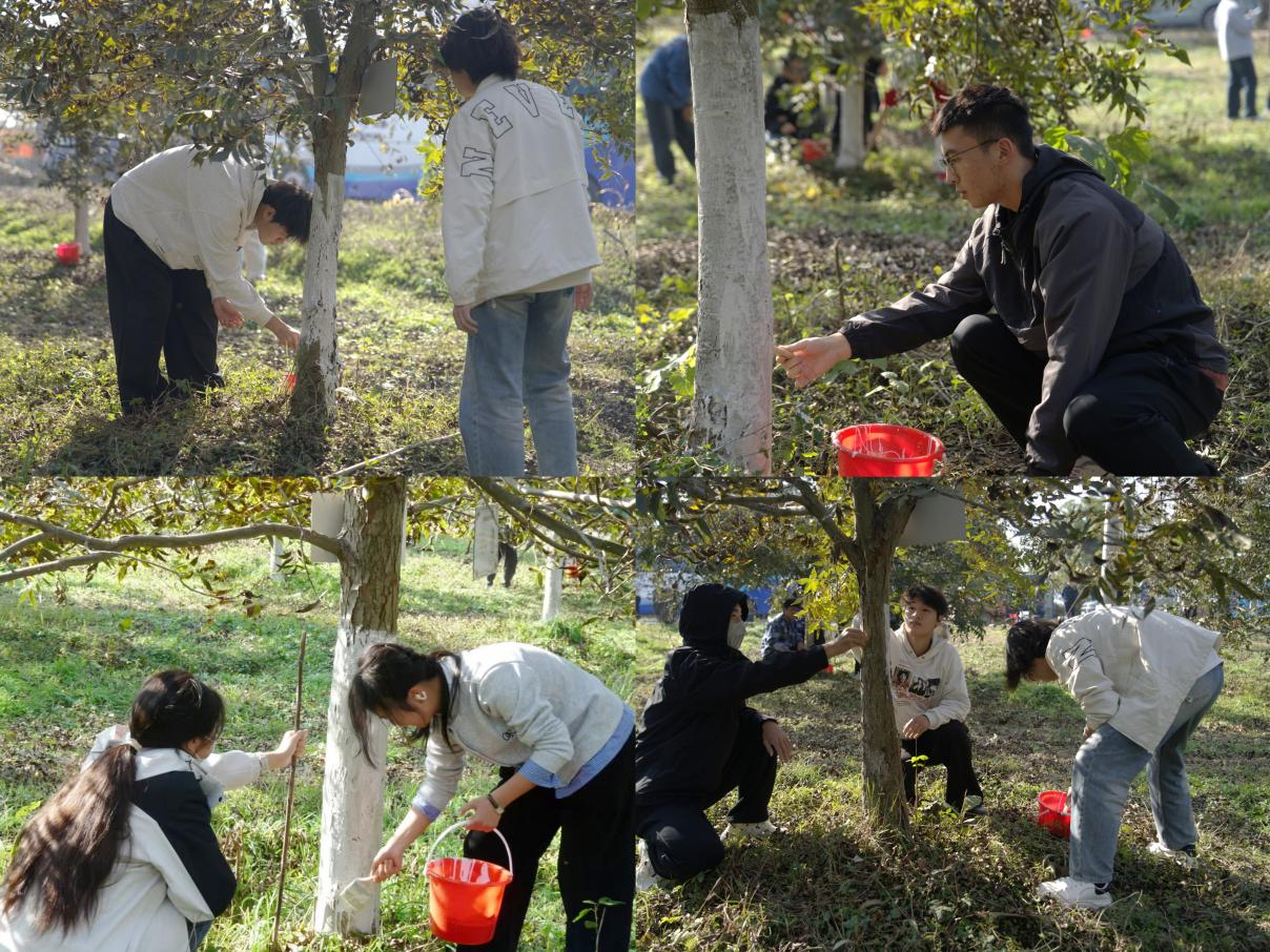 活动伊始,生态园工作人员现场讲解了碧根果树冬季养护知识,重点说明刷白剂的防虫杀菌、防寒抗冻原理,以及清除老翘皮、均匀涂刷的操作要领。同学们分组领取工具后,迅速投入劳作:清理树干杂质、调配涂白剂、手持毛刷细致涂刷、确保树干1.2米高度内全覆盖无遗漏。大家相互协作、干劲十足,冬日暖阳下,一排排碧根果树逐渐披上“防护白装”。